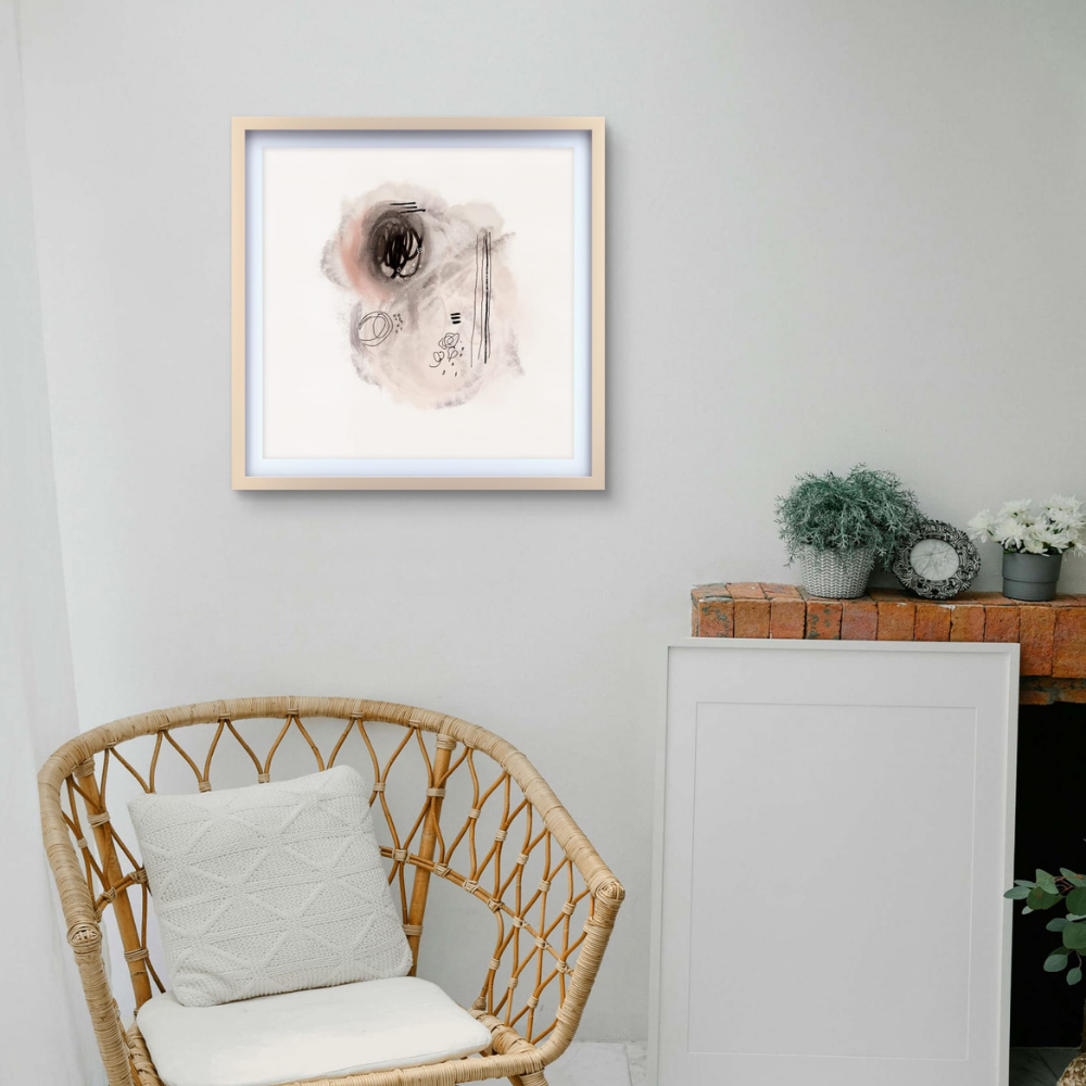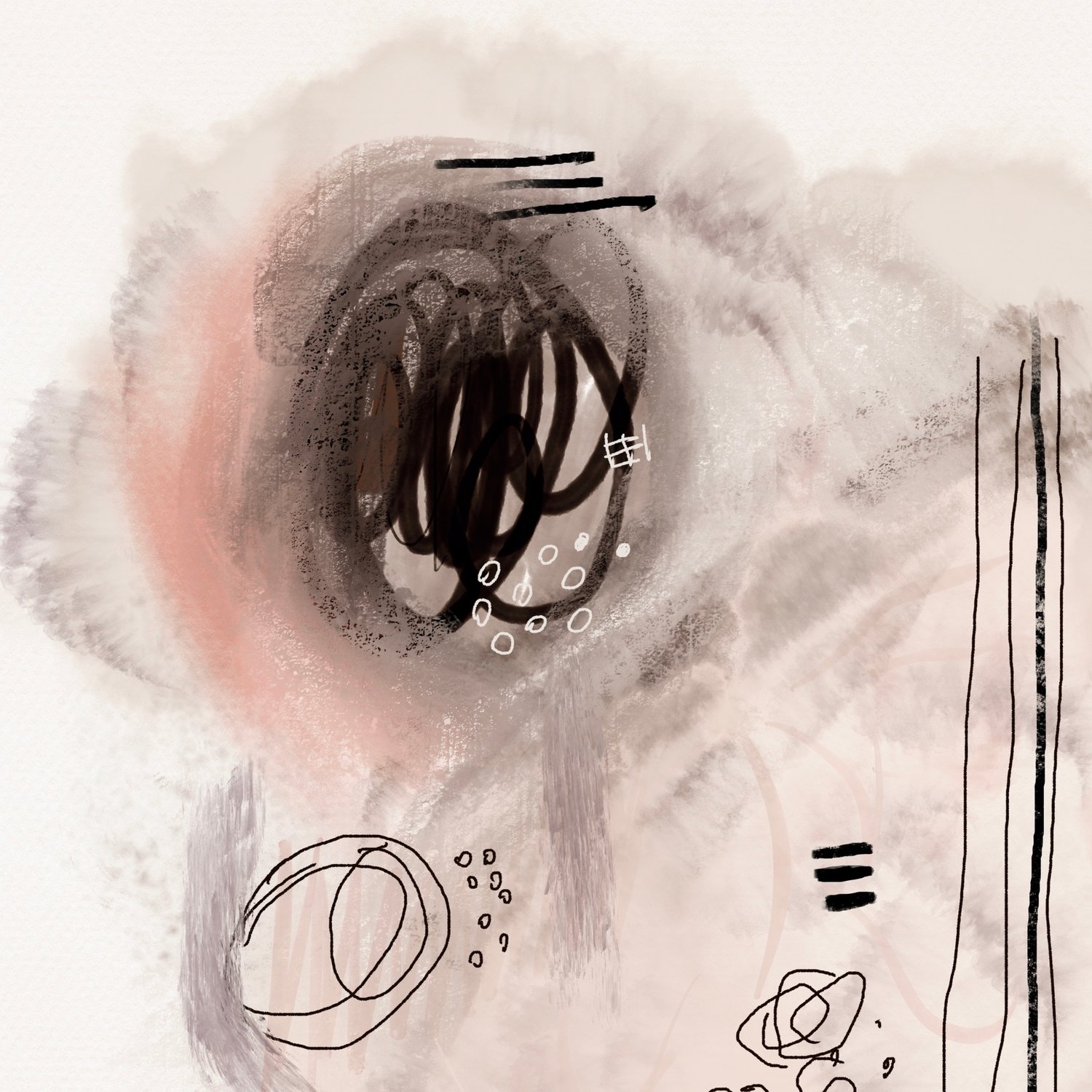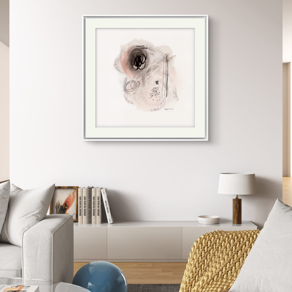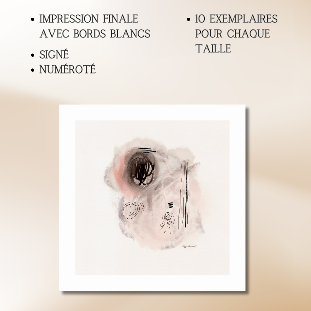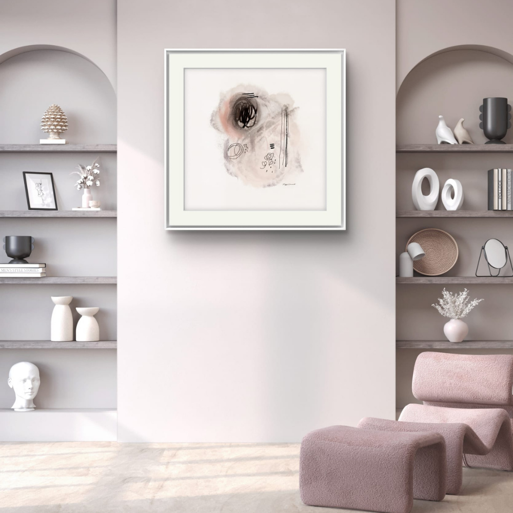 À travers des formes abstraites, des traits délicats de noir, et des nuances douces de rose, elle invite à une contemplation silencieuse.